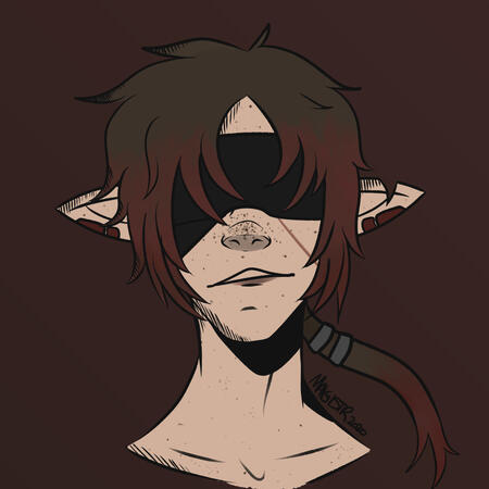 Distinguishing Features: Large scar on the left of his face, distinct freckles all over his face and body, red ear clasps that match his left eye on both ears. Left ear is notched. Has fangs. Red dragon scales line the nape of his neck and fade down his spine, then they become prominent again at the small of his back. Two large matching scars upon each of his shoulder blades.
